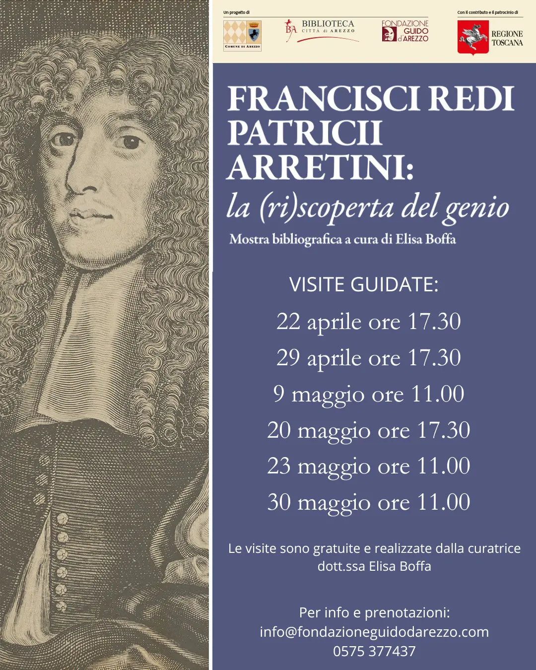 La curatrice dott.ssa Elisa Biffa vi accompagnerà alla scoperta della mostra bibliografica su Francesco Redi. Le visite sono gratuite.