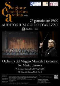 La Stagione Concertistica Aretina si prefigge l’obiettivo di un’offerta musicale di altissima qualità, coniugando un programma accuratamente selezionato tra le eccellenze del panorama internazionale con una serie di scelte e iniziative volte a coinvolgere la città e il pubblico nella maniera più ampia e trasversale. I concerti dell’edizione 2023/2024 porteranno ad Arezzo alcuni tra i più apprezzati artisti del mondo e sono stati ideati per proporre alcuni dei capolavori del repertorio sinfonico, cameristico e lirico.