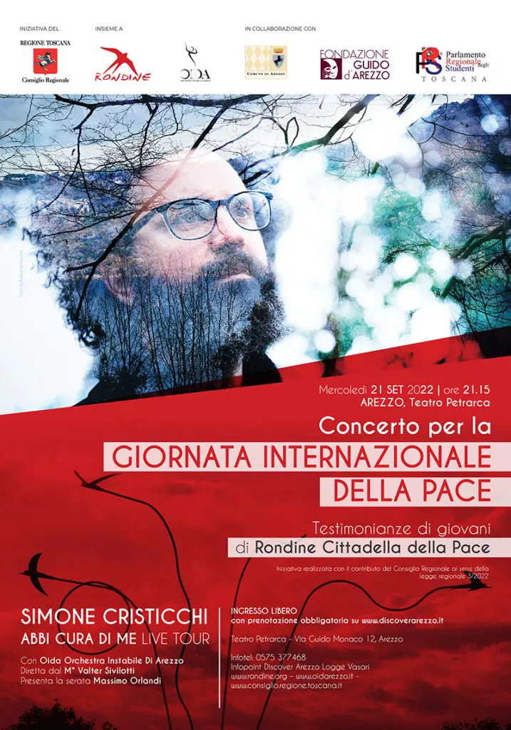 Arezzo celebra il 21 settembre, Giornata Internazionale per la Pace promossa dalle Nazioni Unite, con un evento artistico unico e di grande intensità. La serata, sostenuta e finanziata dal Consiglio Regionale della Toscana, in attuazione della legge 3/2022 e organizzata con Rondine Cittadella della Pace e Oida Orchestra Instabile di Arezzo, vedrà salire sul palco del Teatro Petrarca Simone Cristicchi.