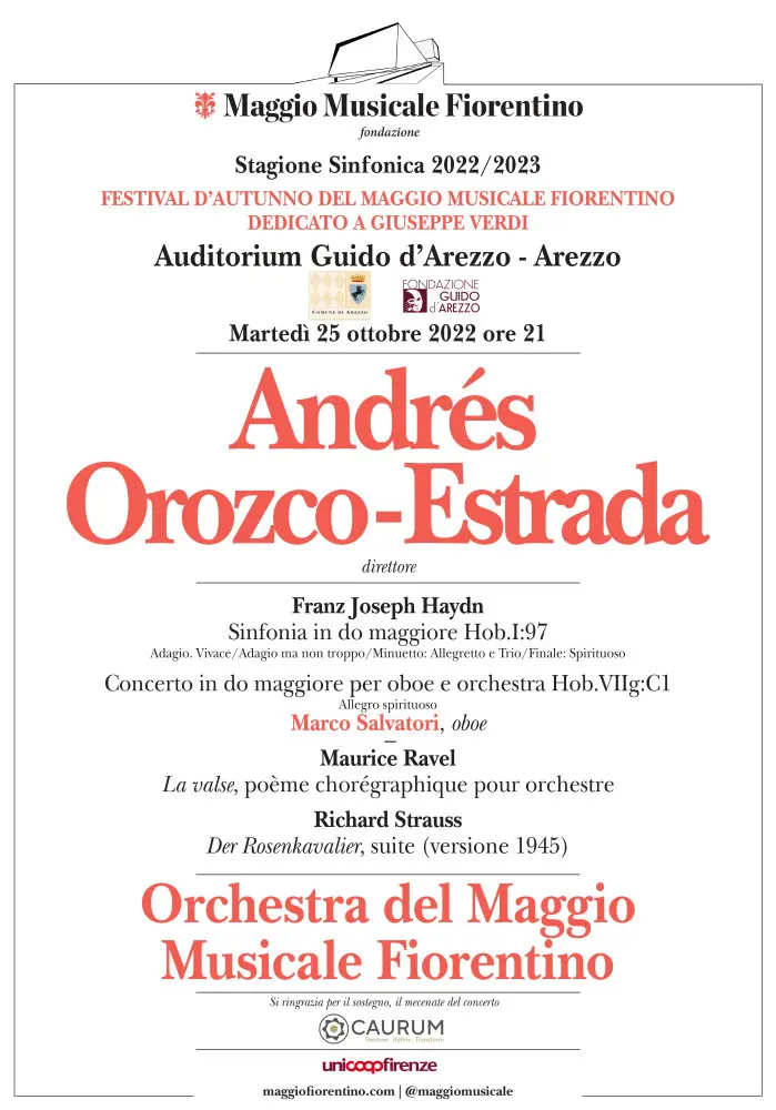 “Sono molto contento di tornare nella splendida Arezzo dopo il concerto dello scorso di quasi un anno fa, era novembre, quando abbiamo inaugurato l’Auditorium Guido d’Arezzo con la meravigliosa Creazione di Franz Joseph Haydn.” Commenta il Sovrintendente e Direttore Artistico del Teatro del Maggio Musicale Fiorentino, Alexander Pereira. “Era stata una serata bellissima e di grande significato, che sono certo sarà replicata anche in questa seconda occasione. Per questo ringrazio il sindaco di Arezzo Alessandro Ghinelli, il direttore della Fondazione Guido d’Arezzo Lorenzo Cinatti e il direttore artistico Zanon per l’invito a tornare con la musica del Maggio all’Auditorium e di nuovo per inaugurare la stagione concertistica. L’anno scorso siamo venuti guidati dal nostro direttore emerito a vita, il maestro Zubin Mehta e torniamo con Andrés Orozco Estrada un grande e acclamato direttore di formazione viennese, energico, elegante che, come se riprendesse un filo musicale lasciato da Mehta a fare da ponte per questo concerto, proporrà una sinfonia di Haydn e sempre del compositore austriaco il concerto per Oboe e Orchestra  e poi due composizioni una di Ravel e una di Strauss. Una cosa che mi fa particolarmente piacere è che il solista all’oboe è una prima parte della nostra Orchestra, il professor Marco Salvatori. La sua partecipazione sottolinea la speciale attenzione alla grande qualità dell’Orchestra del Maggio Musicale Fiorentino.  Ringrazio Unicoop Firenze, che è al nostro fianco in molte iniziative e il mecenate del Concerto Caurum, per il sostegno.”