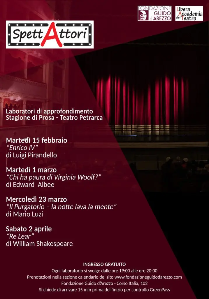 “Spettattori” permetterà di mettersi in gioco con grandi classici della letteratura attraverso quattro incontri: l’apertura sarà dedicata allo spettacolo “Enrico IV” di Luigi Pirandello, poi martedì 1 marzo sarà la volta del laboratorio su “Chi ha paura di Virginia Woolf?” di Edward Albee e mercoledì 23 marzo su “Il Purgatorio – La notte lava la mente” di Mario Luzi, mentre la conclusione è in programma sabato 2 aprile su “Re Lear” di William Shakespeare. Ogni laboratorio si svolgerà dalle 19.00 alle 20.00 nei locali della sede della Fondazione Guido d’Arezzo in Corso Italia 102, con l’unico requisito che è rappresentato dal possesso del Green Pass e con i partecipanti che potranno scegliere se vivere l’intero percorso o singoli appuntamenti.